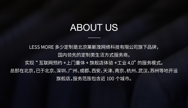 LESS MORE多少定制 2015年5月創(chuàng)立于北京,以互聯(lián)網思維和工業(yè)4.0切入服裝定制領域,獨創(chuàng)“互聯(lián)網預約+旗艦店體驗+免費上門量體+工業(yè)4.0 C2M生產”的模式,現已成為國內服裝定制行業(yè)的標桿品牌。